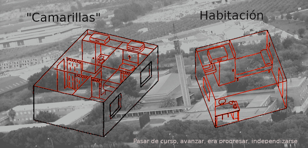 Era al llegar a cursos superiores cuando el aposento de las habitaciones individuales del pabellón de columnas se convertían en una realidad. Era una mezcla de nostalgias por noches turbulentas pasadas y la tranquilidad, la formalidad, la independencia de tener en “propiedad” una habitación privada que disponía de ventana con vistas por un lado a los otros pabellones, al muro de piedra de la iglesia y parte ajardinada hasta zona de estudios, por otro lado vistas a las pistas de baloncesto, piscina, huerto hasta perderse la mirada allá lo lejos.