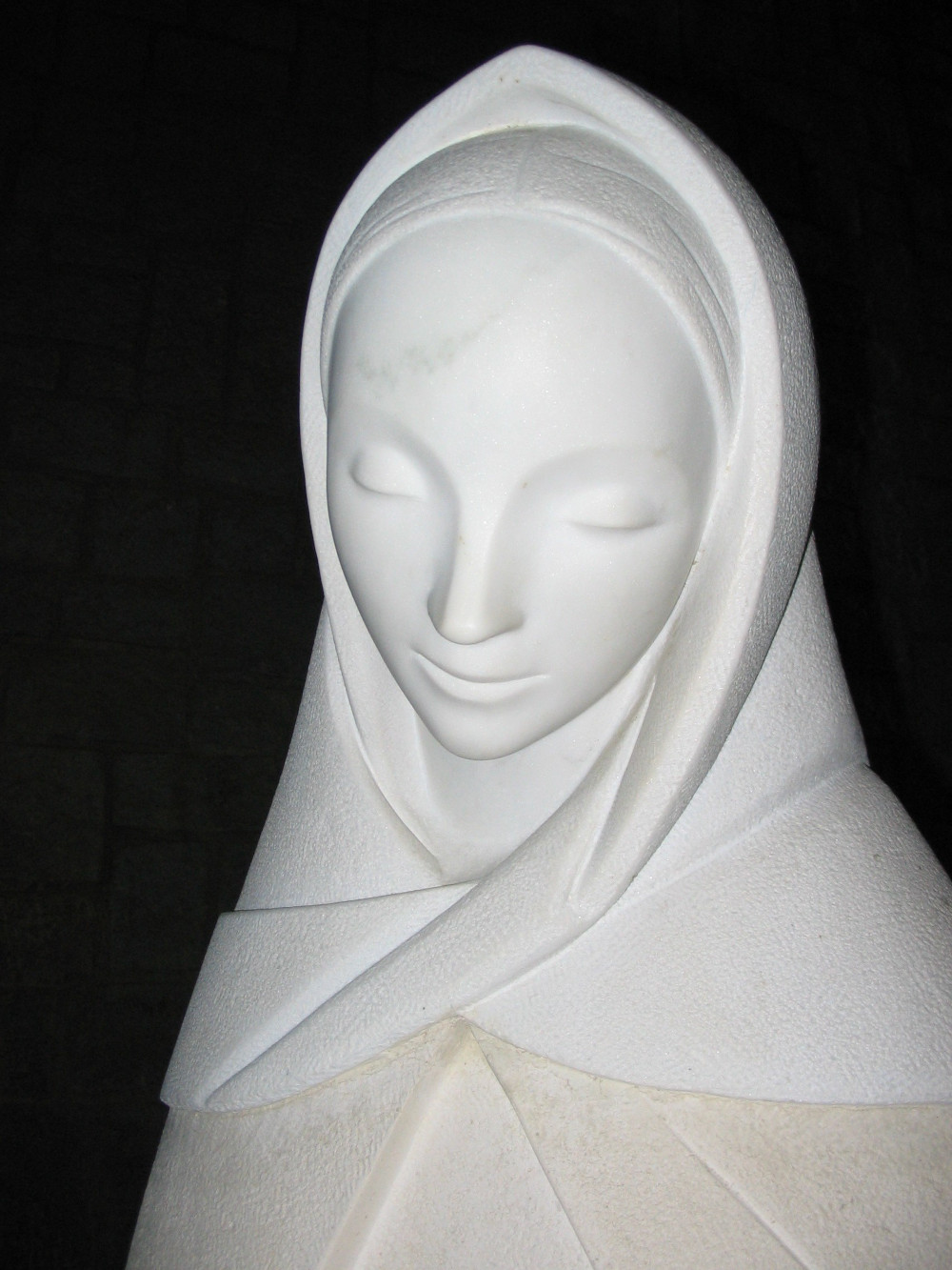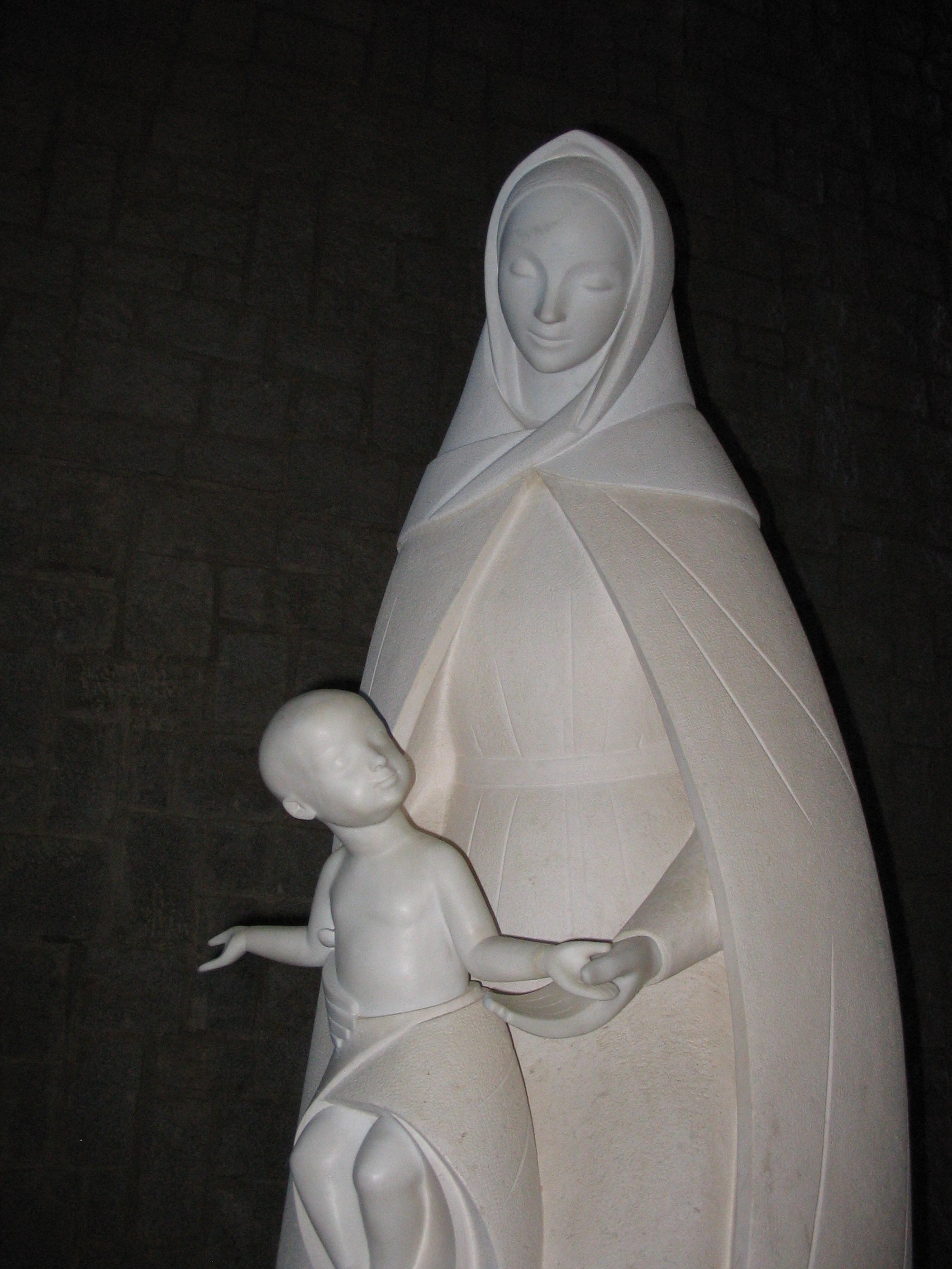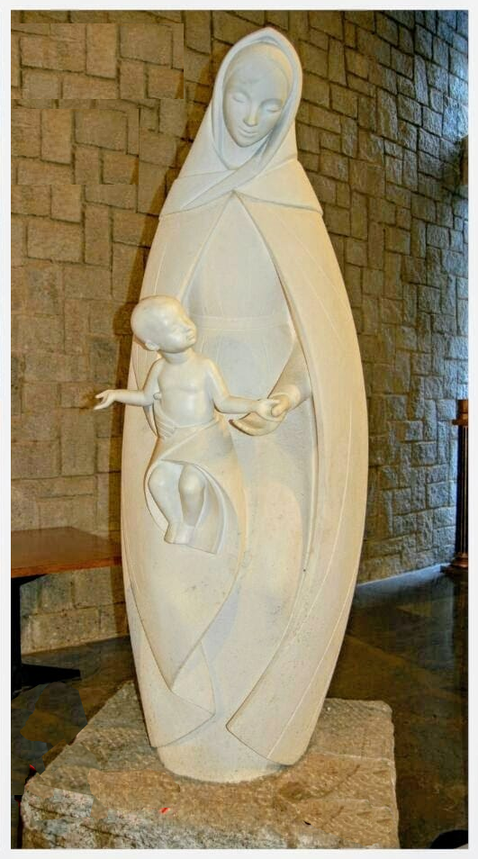 Fray José María Aguilar Collados (1909-1992) fue un escultor madrileño de la Orden Jerónima, que en 1956 es trasladado a Sevilla como prior del Monasterio de San Isidoro del Campo. Su presencia en Sevilla coincide con la apertura de la Iglesia al arte contemporáneo, por lo que sus imágenes reflejan una voluntad explícita de modernidad e innovación, así como una gran libertad respecto a la tradición imaginera local. En 1960 realiza en mármol blanco la Virgen de Belén para la Capilla del Seminario Menor de Pilas, en la que predominan las formas curvas que convierten a la Madre en la cuna del Niño. El autor es capaz de realizar una imagen llena de belleza, ternura y calidez, a pesar del material utilizado, en la que destacan los rostros de la Virgen y del Niño, así como la relación que se establece entre ambos.